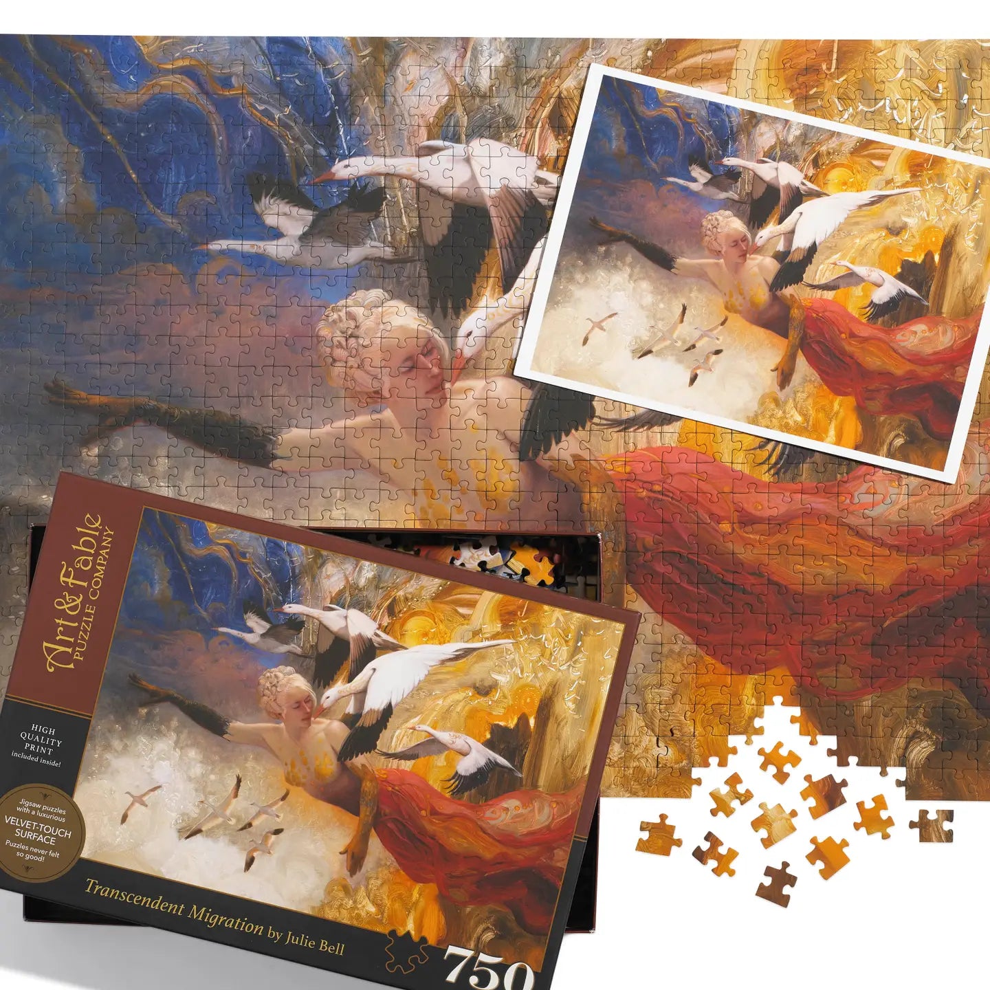 Transcendent Migration is part of our Sweet Spot Collection of 8 perfectly sized, Velvet-Touch puzzles! Like all our puzzles, each box contains these 3 bonus items. A beautiful print A box top stand A zip lock bag The Artist: Julie Bell is a world-renowned wildlife painter and award-winning fantasy artist. Her art depicts the magical bond between humans, animals, and nature through the use of imaginative scenes and bold colors. Puzzle for Good: Donations from the sale of this puzzle will go to Smile Train, an organization providing free cleft repair training to doctors worldwide. smiletrain.org
