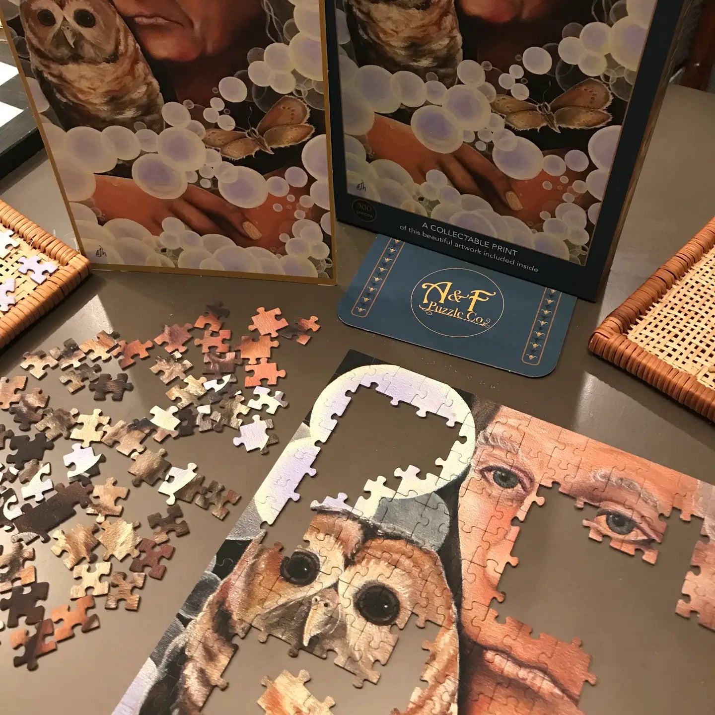 Watcher, Protector, is a work that delivers beauty, magic and kindness. Ausa Hylton is a painter based in Oregon who works primarily in watercolor and oil. Her work is inspired by dreams and the conundrum of their contradictory nature, being both meaningful and meaningless. A&F puzzles display beautifully on a shelf, using minimal space. Exhibit assorted titles like books, showing off their colorful bindings. This particular feature collectors will love and encourage purchasing more than one.
