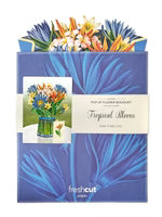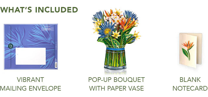 FreshCut Paper's journey of color and design takes flight with our Tropical Bloom bouquet, where the Birds of Paradise embody freedom and optimism amidst vibrant blue Lotus blossoms, symbolizing rebirth, and fragrant Plumeria, a Hawaiian symbol of hope. This whimsical and enduring bouquet evokes the promise of the future.